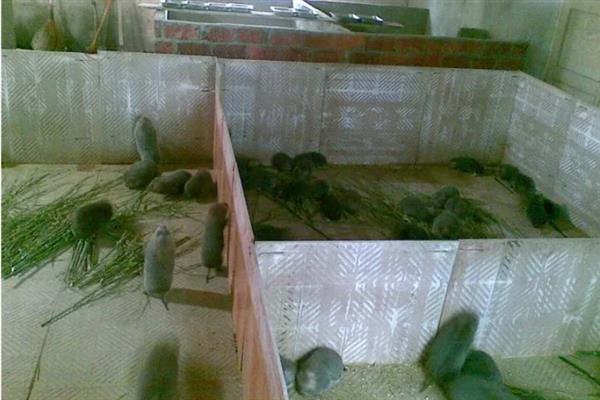 (2)由于竹鼠排泄、采食以及房间的湿气会使得稻草潮湿,所以每天需要更换稻草一次,以确保竹鼠窝尽可能干燥温暖。另外圈舍的温度最好保持在10度以上,产房、小竹鼠及其它体弱竹鼠应该保持在12度以上为好。