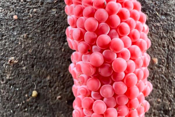 福寿螺常在距离水面10-20厘米的杂草、沟渠石壁上等地方产卵,卵要吸收足够的热量才能孵化,在水中的孵化率较低。